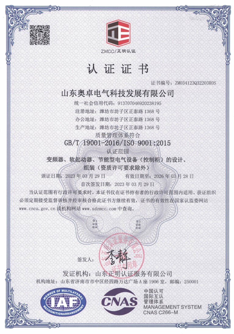 奧卓科技作為變頻器源頭廠(chǎng)家,我們自主研發(fā)生產(chǎn)的奧卓爾品牌變頻器連續多年順利通過(guò)了ISO質(zhì)量管理體系的認證,并于2022年被山東省質(zhì)量評價(jià)協(xié)會(huì )評為了山東優(yōu)質(zhì)品牌,有需要的記得聯(lián)系我們,我們可以為您提供高質(zhì)量的產(chǎn)品和專(zhuān)業(yè)的技術(shù)支持。